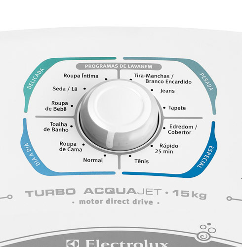 O sistema Turbo Acqua Jet pode ser utilizado em todos os programas de lavagem nos níveis alto e máximo de água. Por meio de uma força centrífuga, o cesto gira em alta rotação, impulsionando as peças para as paredes da lavadora, ao mesmo tempo em que "joga" jatos de água que contribuem para que o sabão penetre ainda mais nas fibras dos tecidos eliminando sujeiras e manchas com mais eficiência.