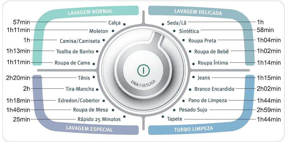 - Função Turbo Secagem: oferece maior potência na centrifugação e circulação de ar no cesto, deixando as roupas mais secas.