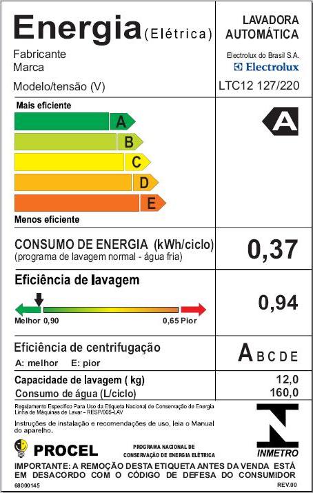- Eficiência de lavagem (127/220V): 0,94;
