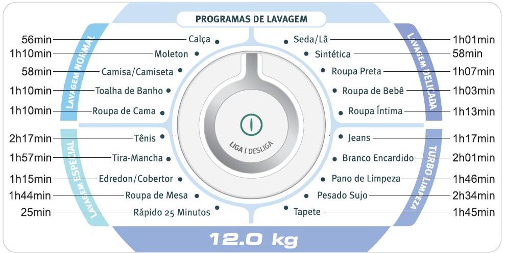- 20 programas de lavagem: Especialmente desenvolvidos para lavar adequadamente todos os tipos de roupa e sujeira: Jeans, Branco Encardido, Tira Mancha, Edredom, Roupa Preta, Roupa de Bebê, Tapete, etc.