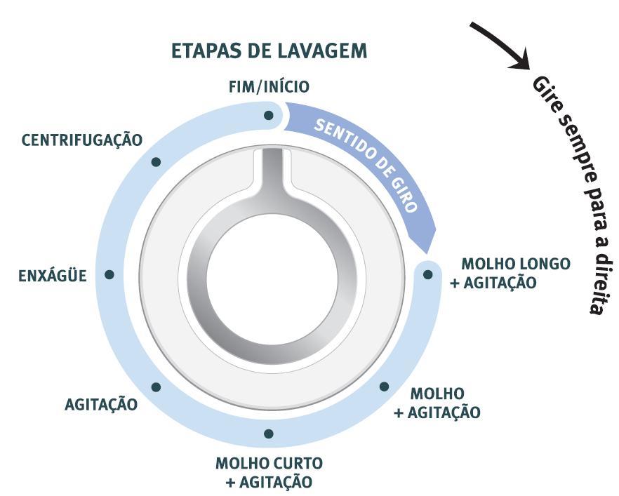 - Programação automática: Você apenas escolhe o programa e o seletor se posiciona e inicia a lavagem na etapa adequada.