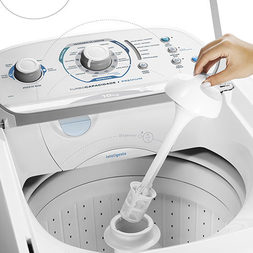 - Diluição inteligente: Mistura automaticamente, e no momento certo, o sabão, o amaciante e o alvejante com a água, evitando manchas nas roupas e um novo enxágue.